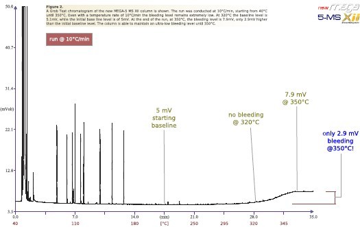 2011年,MEGA公司最新推出的MEGA-5 MS Xil毛細(xì)管柱,是世界上柱流失率最低的新型毛細(xì)管柱產(chǎn)品,圖1顯示:320℃條件下沒有流失現(xiàn)象;350℃條件下基線飄移(流失)2.9mv。